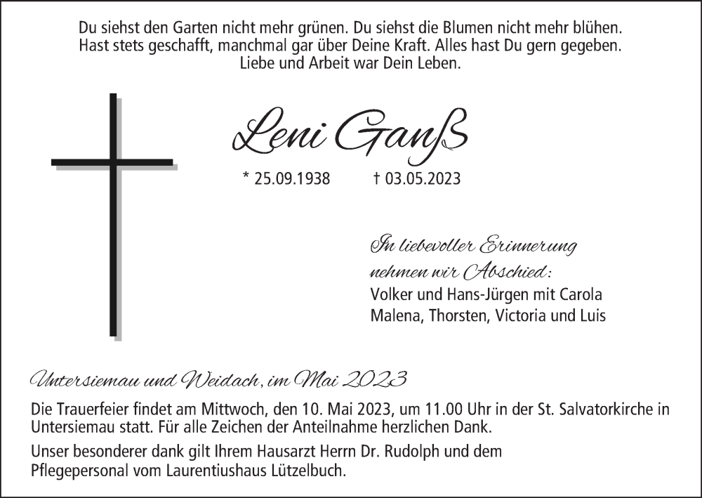 Hier finden Sie alle Traueranzeigen aus der Zeitung, die bisher für 3Leni Ganß erschienen sind. Weitere Traueranzeigen, die in der Zeitung erscheinen, werden hier ebenfalls aufgelistet