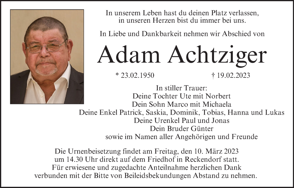 Hier finden Sie alle Traueranzeigen aus der Zeitung, die bisher für Adam Achtziger erschienen sind. Weitere Traueranzeigen, die in der Zeitung erscheinen, werden hier ebenfalls aufgelistet