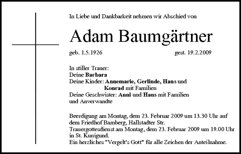 Hier finden Sie alle Traueranzeigen aus der Zeitung, die bisher für Adam Baumgärtner erschienen sind. Weitere Traueranzeigen, die in der Zeitung erscheinen, werden hier ebenfalls aufgelistet