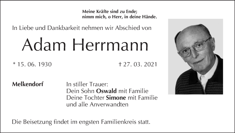 Hier finden Sie alle Traueranzeigen aus der Zeitung, die bisher für Adam Herrmann erschienen sind. Weitere Traueranzeigen, die in der Zeitung erscheinen, werden hier ebenfalls aufgelistet