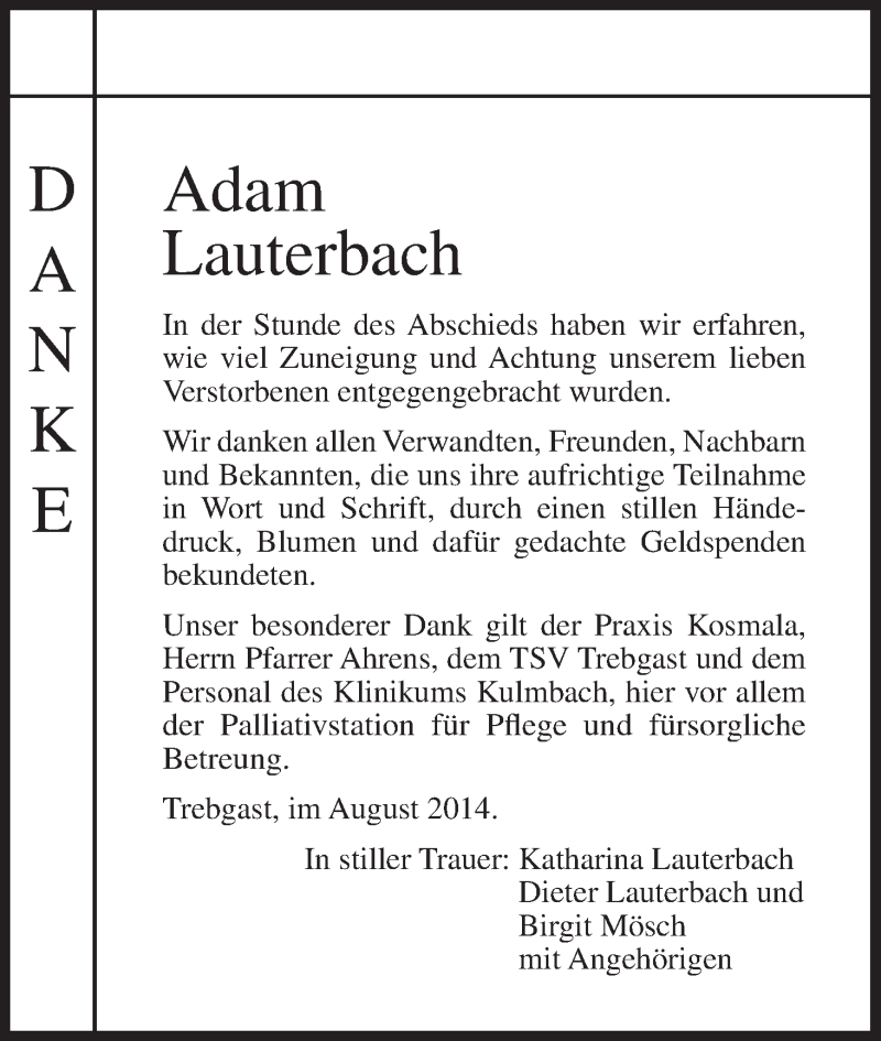 Hier finden Sie alle Traueranzeigen aus der Zeitung, die bisher für Adam Lauterbach erschienen sind. Weitere Traueranzeigen, die in der Zeitung erscheinen, werden hier ebenfalls aufgelistet