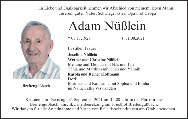 Hier finden Sie alle Traueranzeigen aus der Zeitung, die bisher für Adam Nüßlein erschienen sind. Weitere Traueranzeigen, die in der Zeitung erscheinen, werden hier ebenfalls aufgelistet