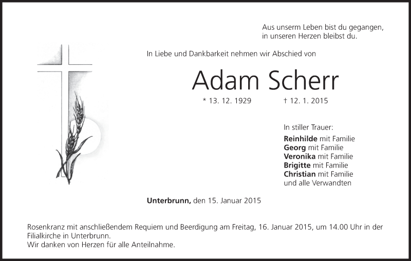 Hier finden Sie alle Traueranzeigen aus der Zeitung, die bisher für Adam Scherr erschienen sind. Weitere Traueranzeigen, die in der Zeitung erscheinen, werden hier ebenfalls aufgelistet