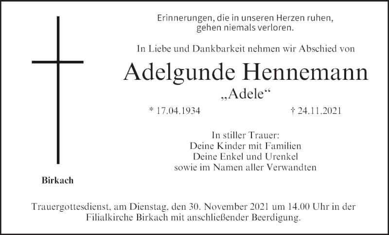 Hier finden Sie alle Traueranzeigen aus der Zeitung, die bisher für Adelgunde Hennemann erschienen sind. Weitere Traueranzeigen, die in der Zeitung erscheinen, werden hier ebenfalls aufgelistet