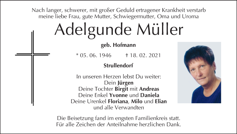 Hier finden Sie alle Traueranzeigen aus der Zeitung, die bisher für Adelgunde Müller erschienen sind. Weitere Traueranzeigen, die in der Zeitung erscheinen, werden hier ebenfalls aufgelistet