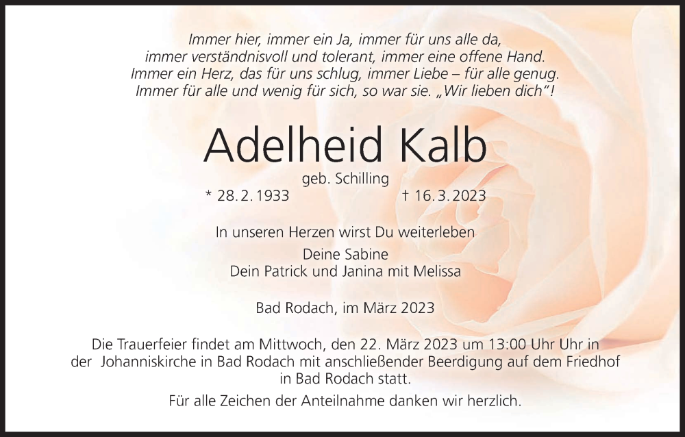 Hier finden Sie alle Traueranzeigen aus der Zeitung, die bisher für Adelheid Kalb erschienen sind. Weitere Traueranzeigen, die in der Zeitung erscheinen, werden hier ebenfalls aufgelistet