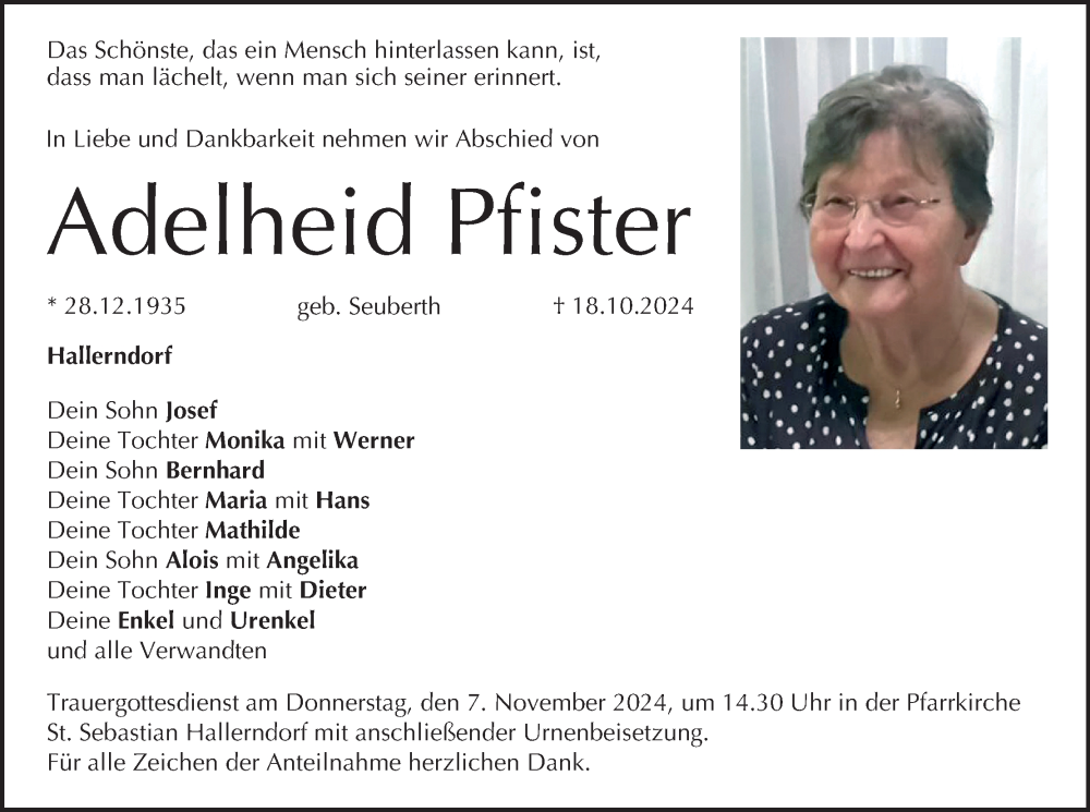 Hier finden Sie alle Traueranzeigen aus der Zeitung, die bisher für Adelheid Pfister erschienen sind. Weitere Traueranzeigen, die in der Zeitung erscheinen, werden hier ebenfalls aufgelistet