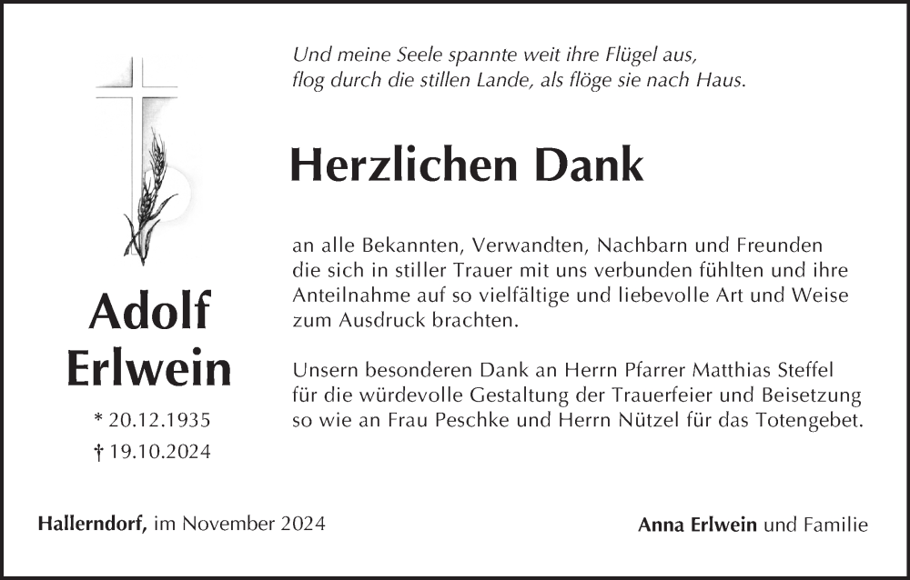 Hier finden Sie alle Traueranzeigen aus der Zeitung, die bisher für Adolf Erlwein erschienen sind. Weitere Traueranzeigen, die in der Zeitung erscheinen, werden hier ebenfalls aufgelistet