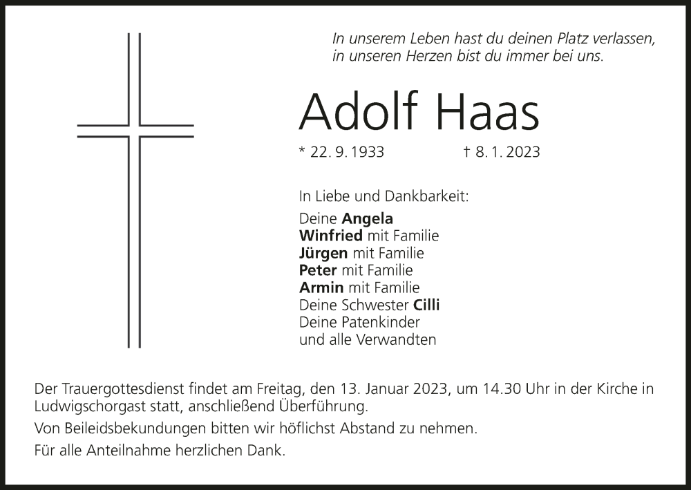 Hier finden Sie alle Traueranzeigen aus der Zeitung, die bisher für Adolf Haas erschienen sind. Weitere Traueranzeigen, die in der Zeitung erscheinen, werden hier ebenfalls aufgelistet