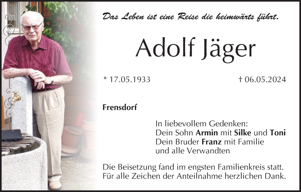 Hier finden Sie alle Traueranzeigen aus der Zeitung, die bisher für Adolf Jäger erschienen sind. Weitere Traueranzeigen, die in der Zeitung erscheinen, werden hier ebenfalls aufgelistet
