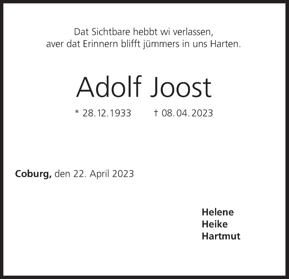 Hier finden Sie alle Traueranzeigen aus der Zeitung, die bisher für Adolf Joost erschienen sind. Weitere Traueranzeigen, die in der Zeitung erscheinen, werden hier ebenfalls aufgelistet