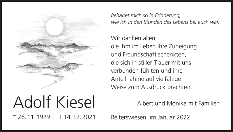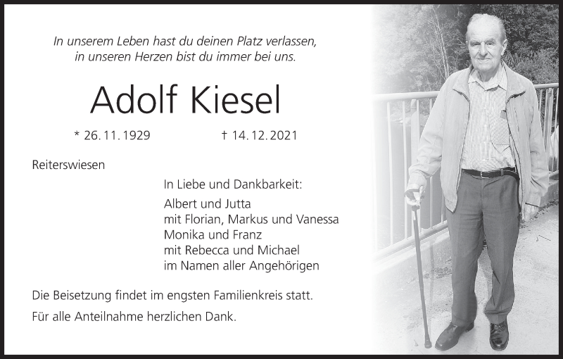 Hier finden Sie alle Traueranzeigen aus der Zeitung, die bisher für Adolf Kiesel erschienen sind. Weitere Traueranzeigen, die in der Zeitung erscheinen, werden hier ebenfalls aufgelistet