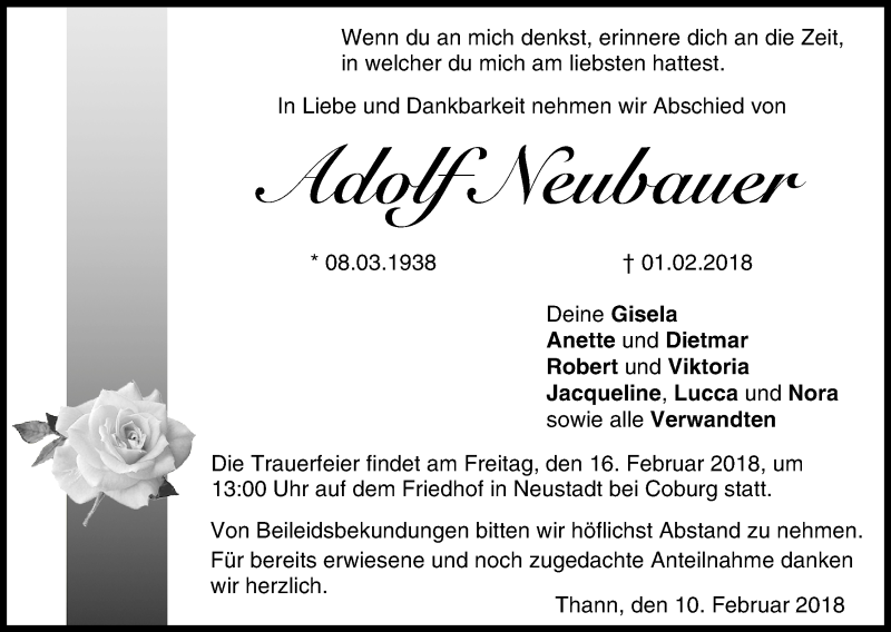 Hier finden Sie alle Traueranzeigen aus der Zeitung, die bisher für Adolf Neubauer erschienen sind. Weitere Traueranzeigen, die in der Zeitung erscheinen, werden hier ebenfalls aufgelistet
