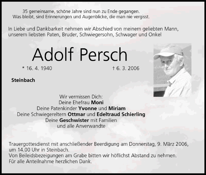 Hier finden Sie alle Traueranzeigen aus der Zeitung, die bisher für Adolf Persch erschienen sind. Weitere Traueranzeigen, die in der Zeitung erscheinen, werden hier ebenfalls aufgelistet