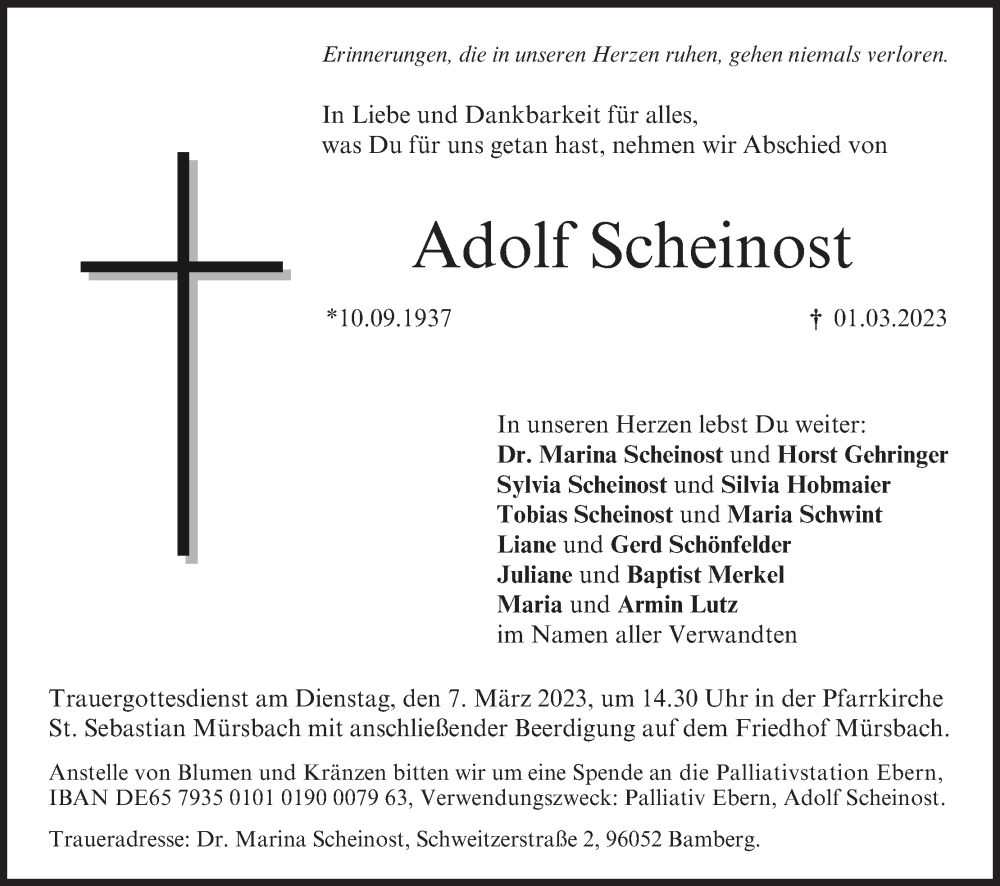 Hier finden Sie alle Traueranzeigen aus der Zeitung, die bisher für Adolf Scheinost erschienen sind. Weitere Traueranzeigen, die in der Zeitung erscheinen, werden hier ebenfalls aufgelistet
