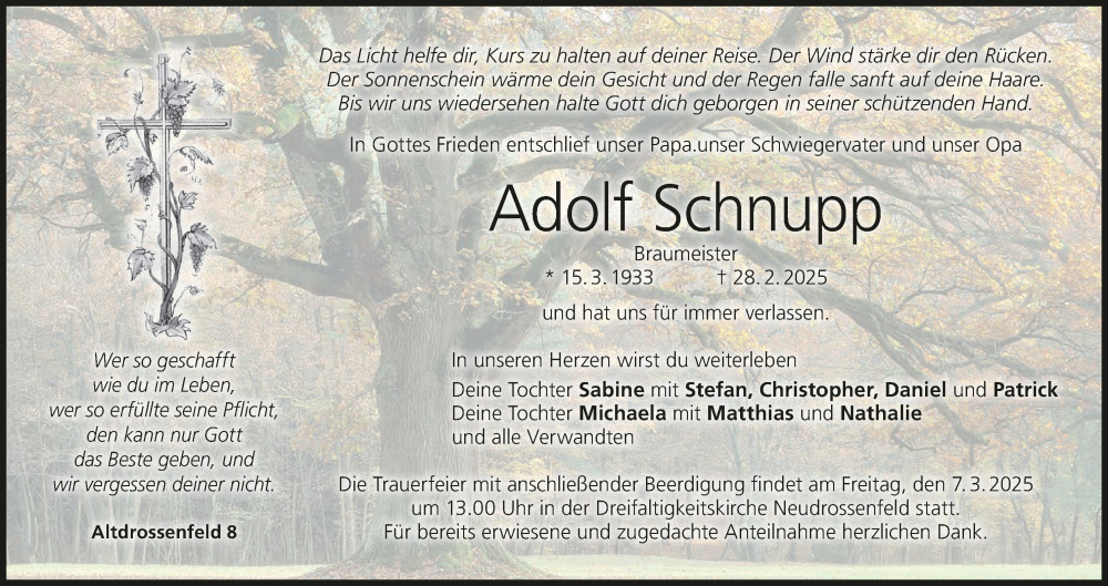 Hier finden Sie alle Traueranzeigen aus der Zeitung, die bisher für Adolf Schnupp erschienen sind. Weitere Traueranzeigen, die in der Zeitung erscheinen, werden hier ebenfalls aufgelistet
