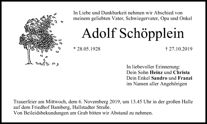 Hier finden Sie alle Traueranzeigen aus der Zeitung, die bisher für Adolf Schöpplein erschienen sind. Weitere Traueranzeigen, die in der Zeitung erscheinen, werden hier ebenfalls aufgelistet