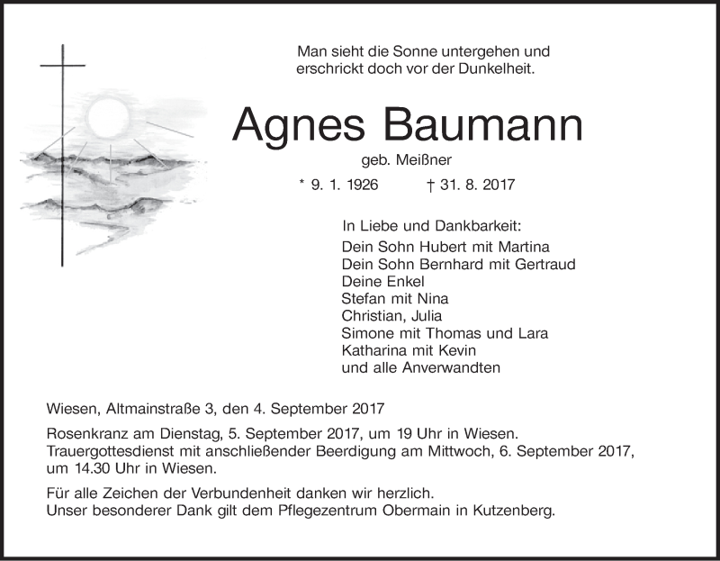 Hier finden Sie alle Traueranzeigen aus der Zeitung, die bisher für Agnes Baumann erschienen sind. Weitere Traueranzeigen, die in der Zeitung erscheinen, werden hier ebenfalls aufgelistet