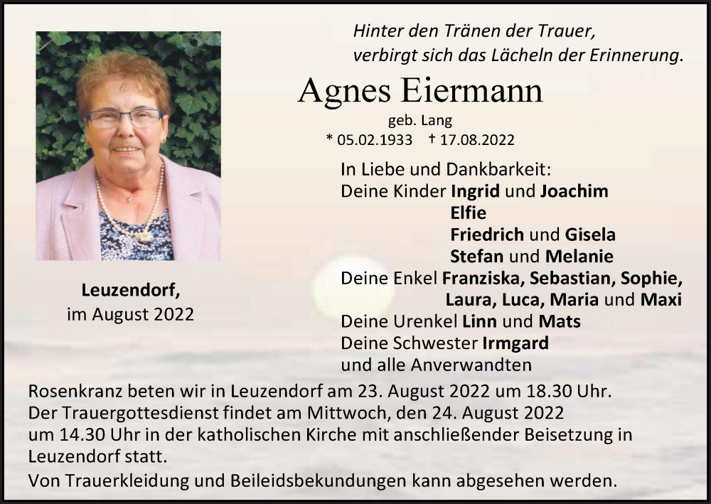 Hier finden Sie alle Traueranzeigen aus der Zeitung, die bisher für Agnes Eiermann erschienen sind. Weitere Traueranzeigen, die in der Zeitung erscheinen, werden hier ebenfalls aufgelistet