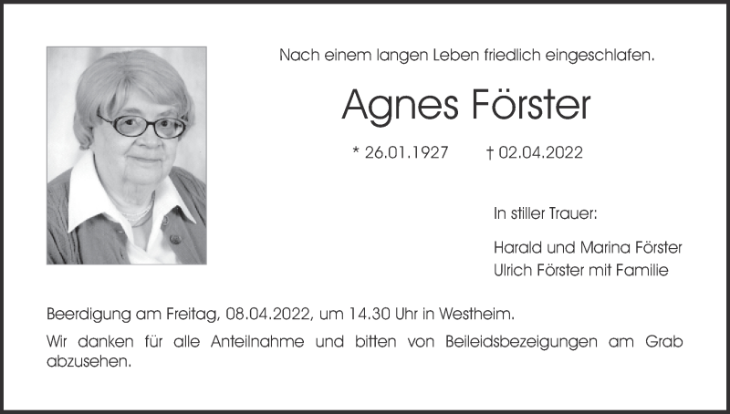 Hier finden Sie alle Traueranzeigen aus der Zeitung, die bisher für Agnes Förster erschienen sind. Weitere Traueranzeigen, die in der Zeitung erscheinen, werden hier ebenfalls aufgelistet