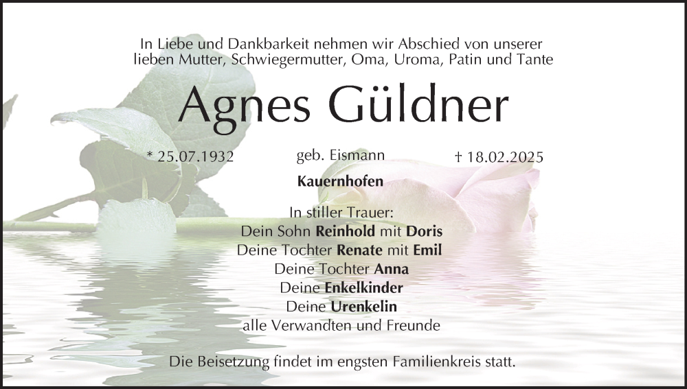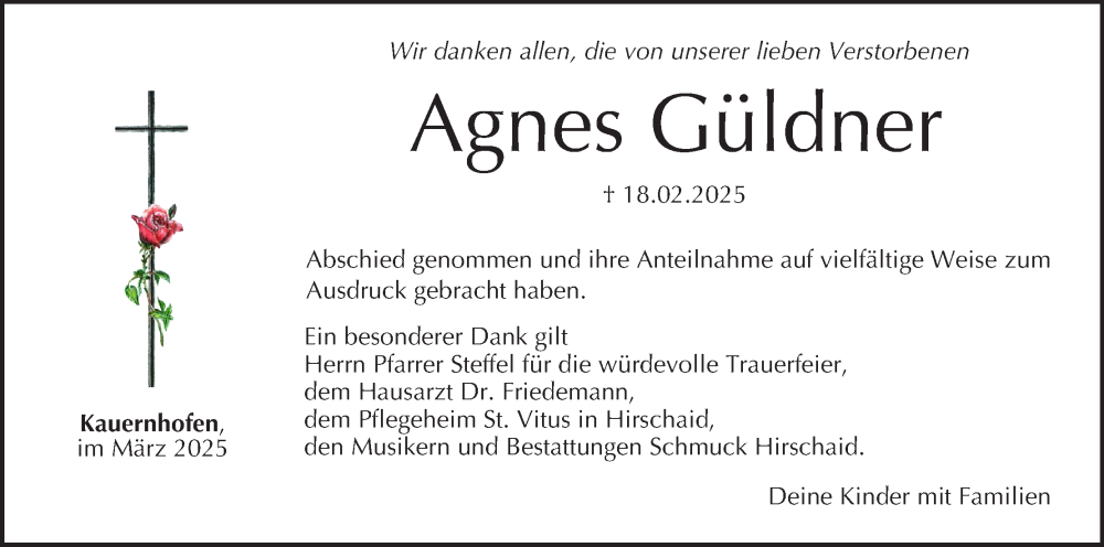 Hier finden Sie alle Traueranzeigen aus der Zeitung, die bisher für Agnes Güldner erschienen sind. Weitere Traueranzeigen, die in der Zeitung erscheinen, werden hier ebenfalls aufgelistet