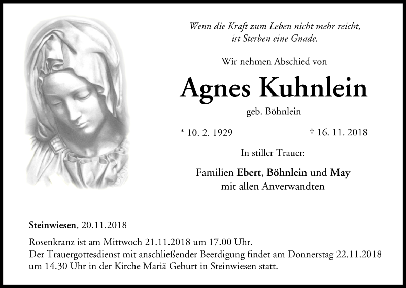 Hier finden Sie alle Traueranzeigen aus der Zeitung, die bisher für Agnes Kuhnlein erschienen sind. Weitere Traueranzeigen, die in der Zeitung erscheinen, werden hier ebenfalls aufgelistet