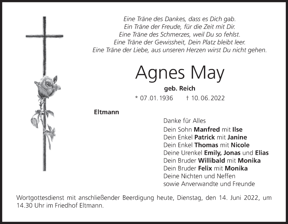 Hier finden Sie alle Traueranzeigen aus der Zeitung, die bisher für Agnes May erschienen sind. Weitere Traueranzeigen, die in der Zeitung erscheinen, werden hier ebenfalls aufgelistet