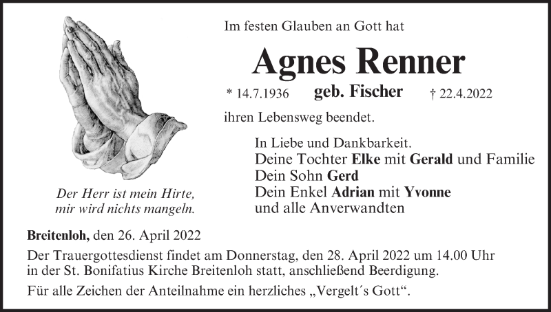 Hier finden Sie alle Traueranzeigen aus der Zeitung, die bisher für Agnes Renner erschienen sind. Weitere Traueranzeigen, die in der Zeitung erscheinen, werden hier ebenfalls aufgelistet