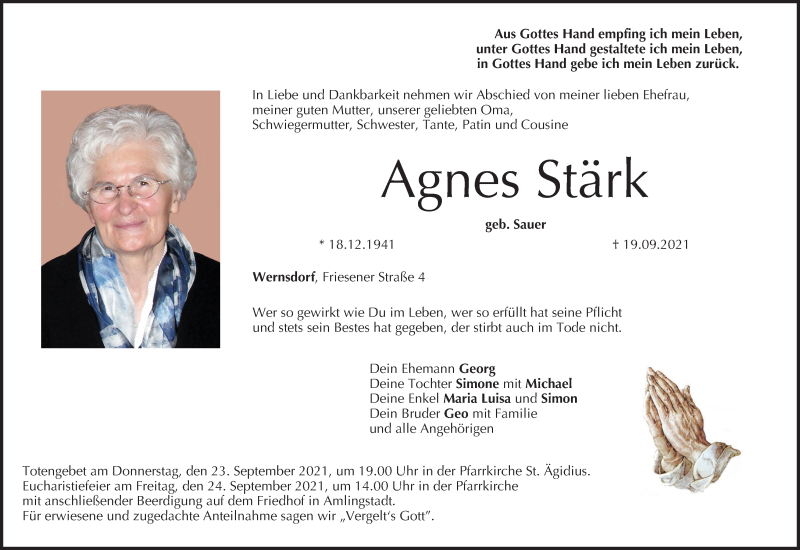 Hier finden Sie alle Traueranzeigen aus der Zeitung, die bisher für Agnes Stärk erschienen sind. Weitere Traueranzeigen, die in der Zeitung erscheinen, werden hier ebenfalls aufgelistet