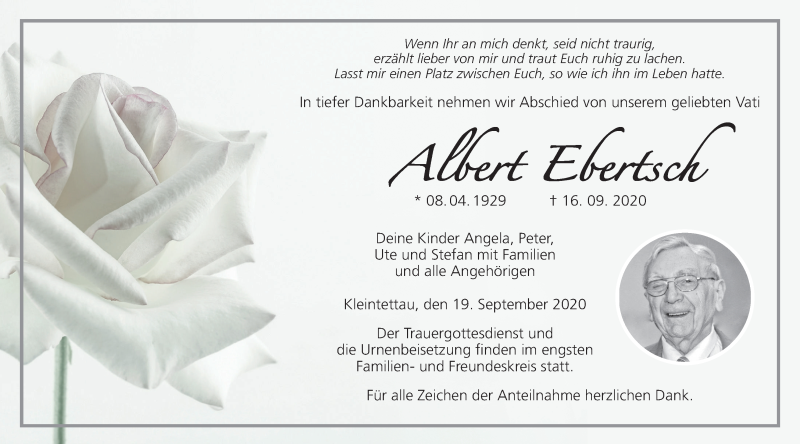 Hier finden Sie alle Traueranzeigen aus der Zeitung, die bisher für Albert Ebertsch erschienen sind. Weitere Traueranzeigen, die in der Zeitung erscheinen, werden hier ebenfalls aufgelistet