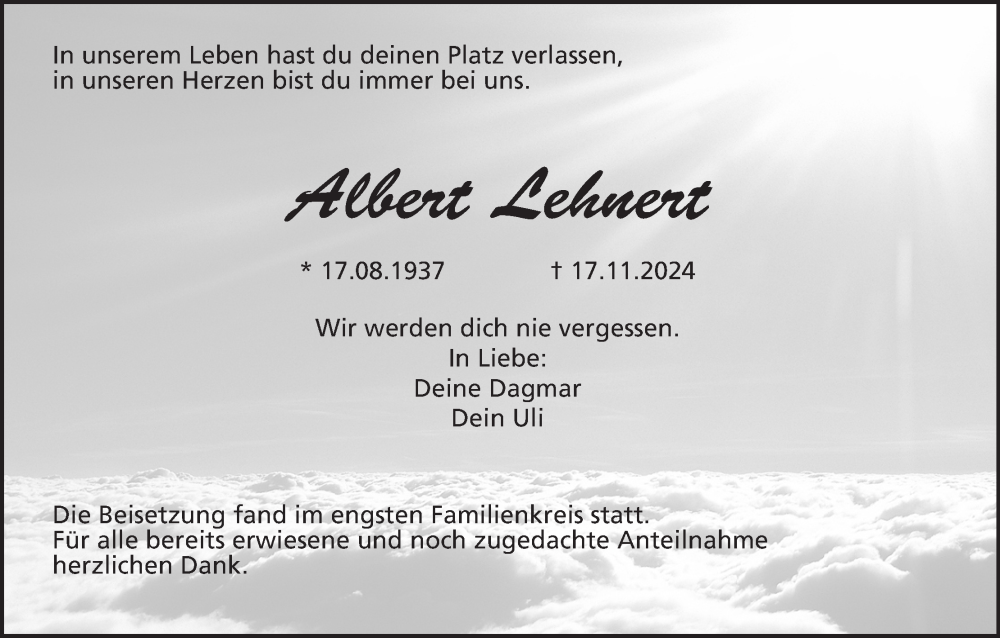 Hier finden Sie alle Traueranzeigen aus der Zeitung, die bisher für Albert Lehnert erschienen sind. Weitere Traueranzeigen, die in der Zeitung erscheinen, werden hier ebenfalls aufgelistet