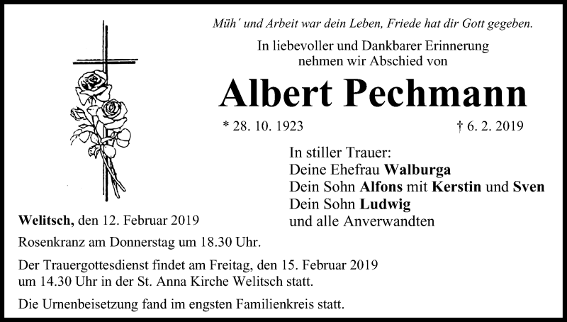 Hier finden Sie alle Traueranzeigen aus der Zeitung, die bisher für Albert Pechmann erschienen sind. Weitere Traueranzeigen, die in der Zeitung erscheinen, werden hier ebenfalls aufgelistet