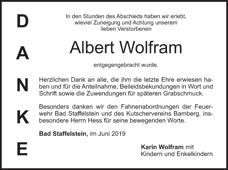 Hier finden Sie alle Traueranzeigen aus der Zeitung, die bisher für Albert Wolfram erschienen sind. Weitere Traueranzeigen, die in der Zeitung erscheinen, werden hier ebenfalls aufgelistet