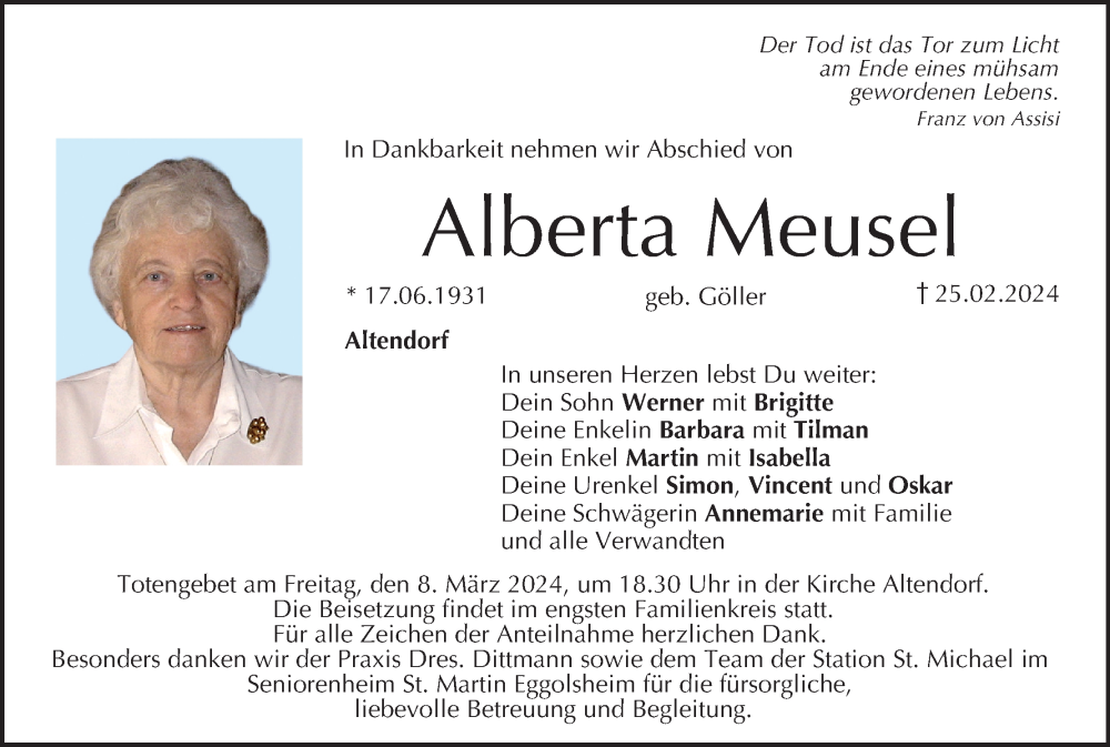Hier finden Sie alle Traueranzeigen aus der Zeitung, die bisher für Alberta Meusel erschienen sind. Weitere Traueranzeigen, die in der Zeitung erscheinen, werden hier ebenfalls aufgelistet