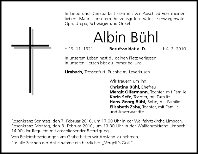 Hier finden Sie alle Traueranzeigen aus der Zeitung, die bisher für Albin Bühl erschienen sind. Weitere Traueranzeigen, die in der Zeitung erscheinen, werden hier ebenfalls aufgelistet