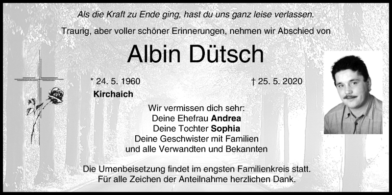 Hier finden Sie alle Traueranzeigen aus der Zeitung, die bisher für Albin Dütsch erschienen sind. Weitere Traueranzeigen, die in der Zeitung erscheinen, werden hier ebenfalls aufgelistet