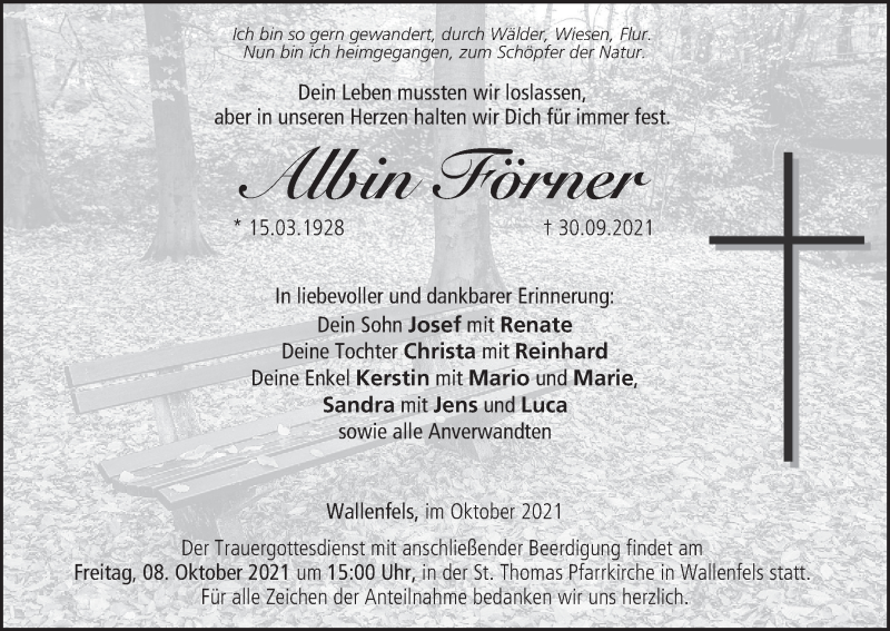Hier finden Sie alle Traueranzeigen aus der Zeitung, die bisher für Albin Förner erschienen sind. Weitere Traueranzeigen, die in der Zeitung erscheinen, werden hier ebenfalls aufgelistet