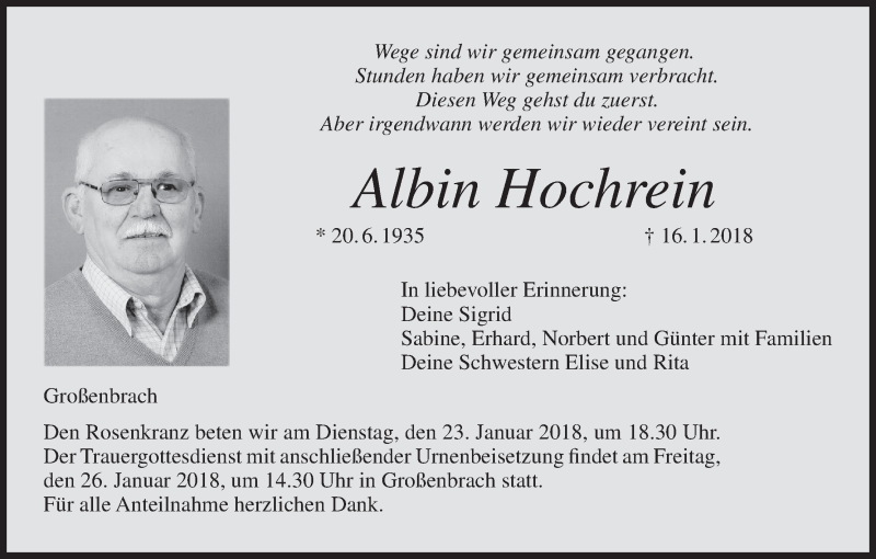 Hier finden Sie alle Traueranzeigen aus der Zeitung, die bisher für Albin Hochrein erschienen sind. Weitere Traueranzeigen, die in der Zeitung erscheinen, werden hier ebenfalls aufgelistet