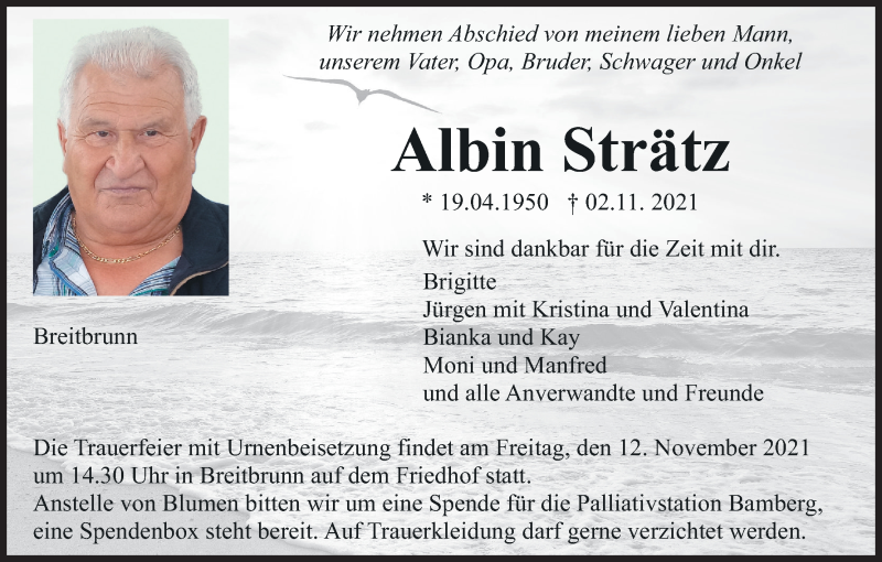 Hier finden Sie alle Traueranzeigen aus der Zeitung, die bisher für Albin Strätz erschienen sind. Weitere Traueranzeigen, die in der Zeitung erscheinen, werden hier ebenfalls aufgelistet