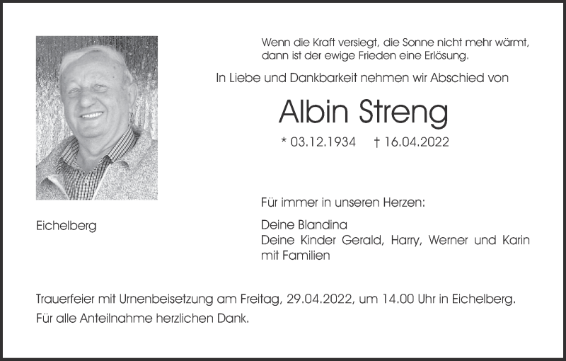 Hier finden Sie alle Traueranzeigen aus der Zeitung, die bisher für Albin Streng erschienen sind. Weitere Traueranzeigen, die in der Zeitung erscheinen, werden hier ebenfalls aufgelistet