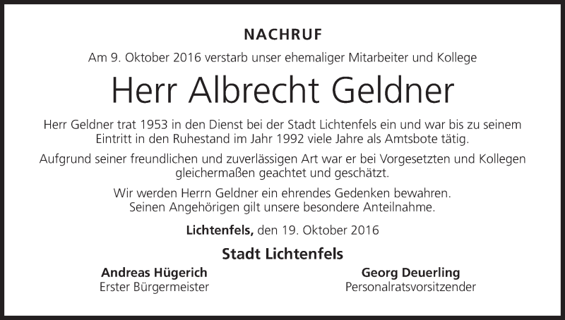 Hier finden Sie alle Traueranzeigen aus der Zeitung, die bisher für Albrecht Geldner erschienen sind. Weitere Traueranzeigen, die in der Zeitung erscheinen, werden hier ebenfalls aufgelistet