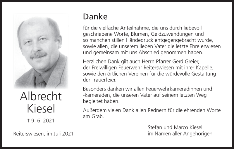 Hier finden Sie alle Traueranzeigen aus der Zeitung, die bisher für Albrecht Kiesel erschienen sind. Weitere Traueranzeigen, die in der Zeitung erscheinen, werden hier ebenfalls aufgelistet