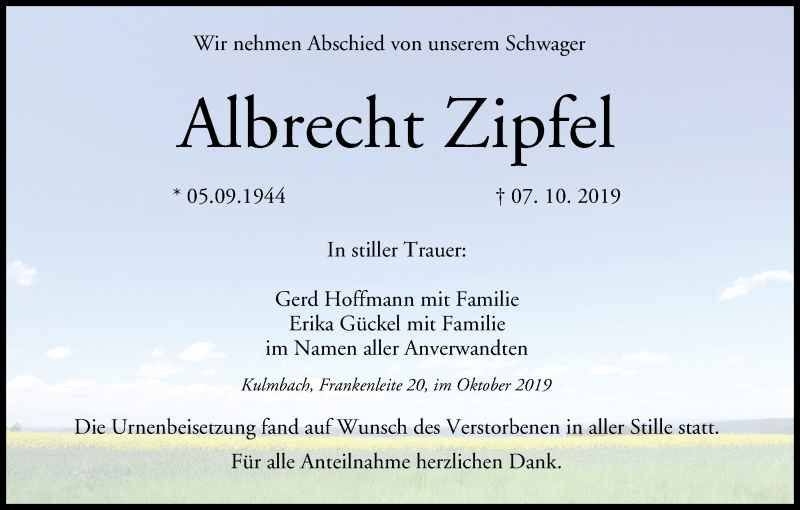 Hier finden Sie alle Traueranzeigen aus der Zeitung, die bisher für Albrecht Zipfel erschienen sind. Weitere Traueranzeigen, die in der Zeitung erscheinen, werden hier ebenfalls aufgelistet