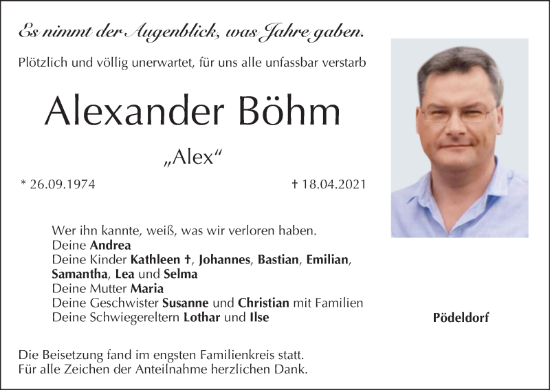 Hier finden Sie alle Traueranzeigen aus der Zeitung, die bisher für Alexander Böhm erschienen sind. Weitere Traueranzeigen, die in der Zeitung erscheinen, werden hier ebenfalls aufgelistet