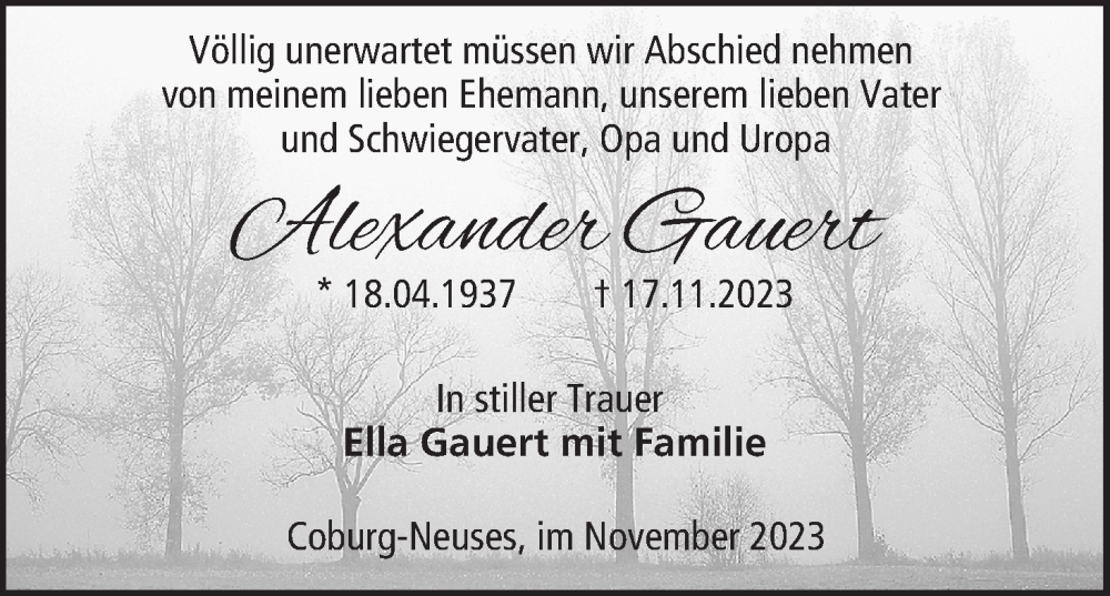 Hier finden Sie alle Traueranzeigen aus der Zeitung, die bisher für Alexander Gauert erschienen sind. Weitere Traueranzeigen, die in der Zeitung erscheinen, werden hier ebenfalls aufgelistet