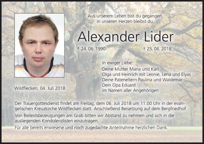 Hier finden Sie alle Traueranzeigen aus der Zeitung, die bisher für Alexander Lider erschienen sind. Weitere Traueranzeigen, die in der Zeitung erscheinen, werden hier ebenfalls aufgelistet