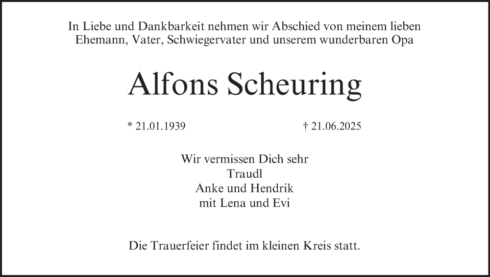 Hier finden Sie alle Traueranzeigen aus der Zeitung, die bisher für Alfons Scheuring erschienen sind. Weitere Traueranzeigen, die in der Zeitung erscheinen, werden hier ebenfalls aufgelistet