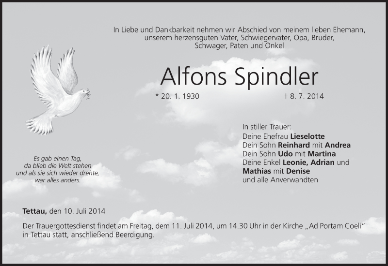 Hier finden Sie alle Traueranzeigen aus der Zeitung, die bisher für Alfons Spindler erschienen sind. Weitere Traueranzeigen, die in der Zeitung erscheinen, werden hier ebenfalls aufgelistet