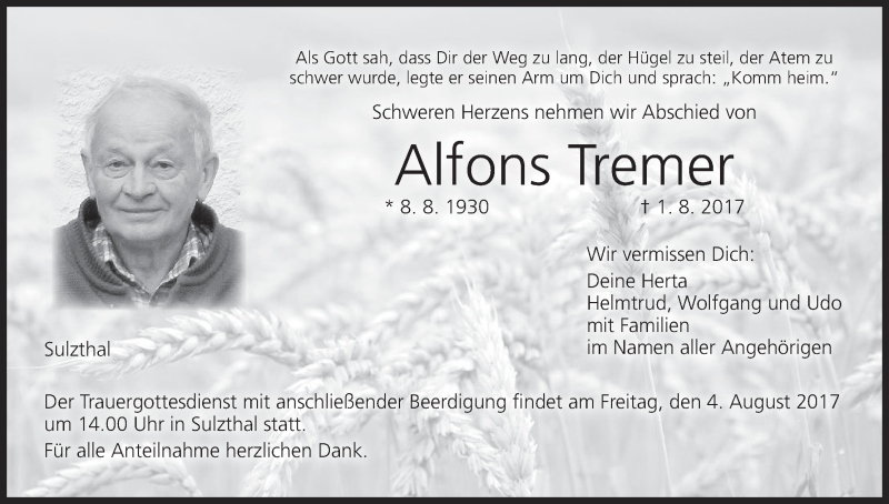 Hier finden Sie alle Traueranzeigen aus der Zeitung, die bisher für Alfons Tremer erschienen sind. Weitere Traueranzeigen, die in der Zeitung erscheinen, werden hier ebenfalls aufgelistet