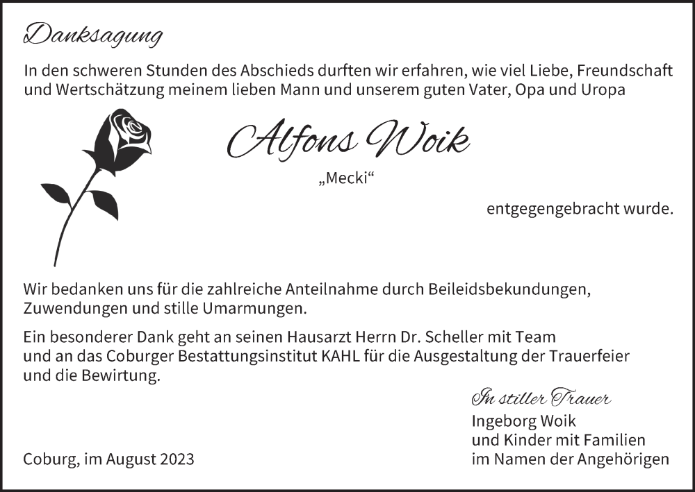 Hier finden Sie alle Traueranzeigen aus der Zeitung, die bisher für Alfons Woik erschienen sind. Weitere Traueranzeigen, die in der Zeitung erscheinen, werden hier ebenfalls aufgelistet